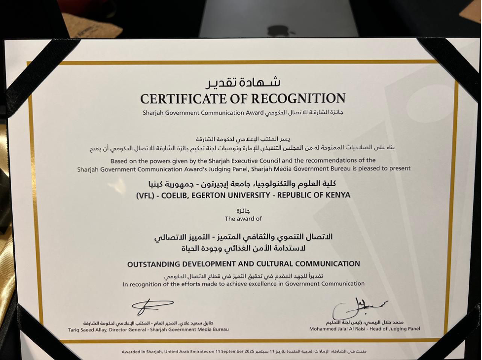 CoELIB continued to expand its international imprint this week during the Sharjah Government Communication Award (SGCA 2025) in the United Arab Emirates (UAE), with the centre's director, Prof. Alexander Kahi, receiving the Outstanding Development and Cultural Communication Award presented by His Highness Sheikh Sultan Al Ahmed Qassimi, deputy ruler of the Emirate of Sharjah, during the ceremony that drew innovators and leaders from around the world.